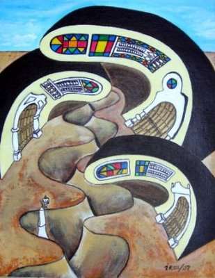 JRM. Como he dicho en otras ocasiones, trato que mi pintura esté considerada cubana aunque haya sido creada allende del mar. Mis pueblos sugieren casas de campaña pero con los ventanales y vitrales tan propios de mi isla. Estos tienen movimientos, son monocromados y sólo los vitrales son coloridos. Mis edificios a veces se convierten en personajes, animales y objetos que ayudan a unir. Hay precipicios donde se ve a la nueva generación saliendo desde el centro de la tierra. Trato de que mis casas y edificios no se parezcan a los de ningún pintor cubano sólo las vidrieras te dejan saber que eso es Cuba. Por un tiempo soñé todas las noches que yo vivía en una aldea blanca (imagino que era en el sur de España). Mi casa era la primera con un patio interior, con un árbol grande. Había un precipicio y siempre me despertaba frente a este. Sin darme cuenta en mis obras aparecían estos hasta que un día le comenté a una amiga pintora sobre mis sueños, me dijo que se veían reflejados en mis pinturas. Hasta ese momento yo no me había percatado de eso. Creo que esa experiencia fue de una vida pasada la cual terminó lanzándome al vacío. Cuando pinto personas saliendo de estos es como la continuidad mediante una nueva vida. Mis naturalezas no son "muertas" o "vivas" como decía Frida Khalo, sino suicidas. Cuando una fruta se madura, esta se cae del árbol y en la caída se suicida, pues llega aplastada al piso. Mis arreglos florales son con las flores hacia adentro y los tallos hacia afuera pues creo que estos son parte esencial en el desarrollo de una flor y merecen también estar expuestos como adornos en un jarrón, etc. No me gustan los convencionalismos académicos. Recuerdo cuando hice una serie de desnudos en los que las personas salían de la pintura y sólo se veía parte del cuerpo. Ahí no había balance, el equilibrio no existía. Trato de hacer lo que no se hace. Igualmente en mi vida a veces desayuno arroz con moros, yuca con mojo y lechón asado a las 7:00am y a las 12:00 p.m. me tomo un vaso de leche y pan con aceite, etc., en fin hago lo que me place en cada momento. Si eso es sub-realismo, así es mi vida cotidiana.